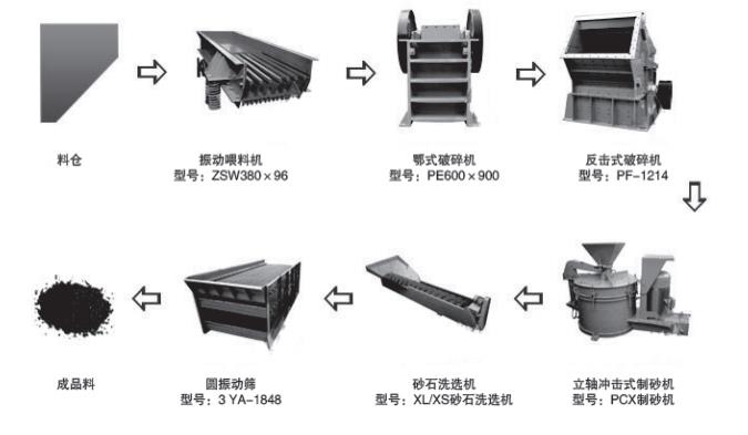 5.主機配置:振動喂料機、鄂式破碎機、反擊式破碎機、立軸沖擊式制砂機、圓振動篩、砂石洗選機等系統組成。